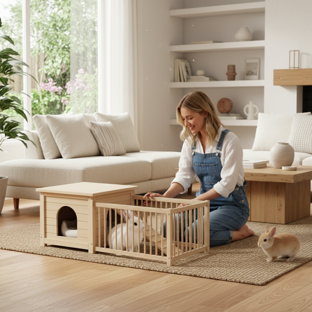 Verqano Indoor Rabbit House | Modern Wooden Bunny Hutch with Playpen Area